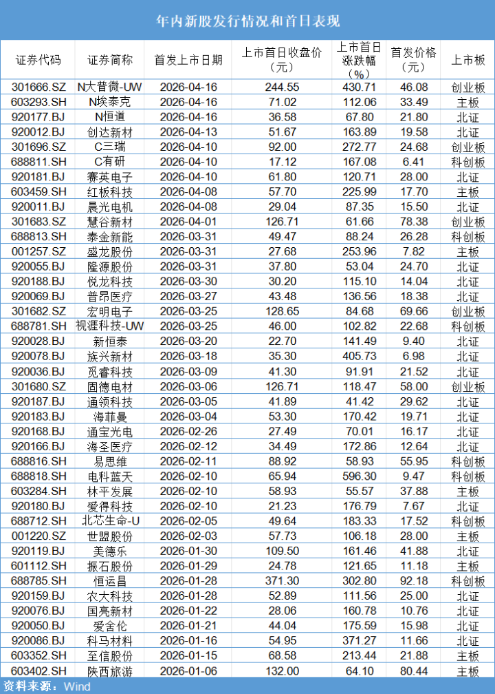 不过,月内部分新股的“首秀”表现并不十分亮眼。4月16日,恒道科技上市首日的67.8%涨幅,在北交所年内新股排行榜中处于队尾,仅高于隆源股份(920055.BJ)、通领科技(920187.BJ)。
